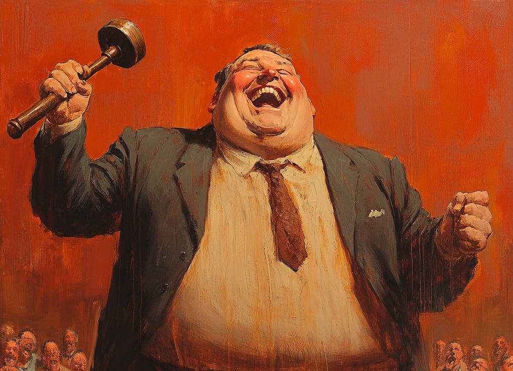 As Bellylaugh drifted toward the ground, his mind wandered. He recalled the elderly couple he’d bludgeoned with his steel-reinforced gavel ten years before, and the added thrill of finding the diamond rings among their possessions. Today, he felt no regret—he had long since perfected the art of meditation and the banishing of negative thoughts. Those diamond rings held sentimental value. They represented his first double murder, a turning point that changed his life for the better. Instead of the risks involved in robbing a home, he’d discovered it was far easier to dispose of the occupants first. Making it appear like a robbery gone wrong led the police in confusing directions—he only ever took a few select items. And with the elderly, no one ever knew what hidden valuables they might still possess. He had perfected the art of murder first, pilfering second. This method required much less planning and carried little chance of being caught. Yes, those diamond rings were special. His current girlfriend knew about the rings, but not their history. In her naivete, she believed he might one day give them to her and always agreed to his nightmarish bouts of ‘slap and tickle’ in her quest for marriage—and she was determined. But this time, she would be rewarded. At the end of today’s auction, he planned to propose to her right there in front of the bidders. He was, after all, a romantic in disguise.